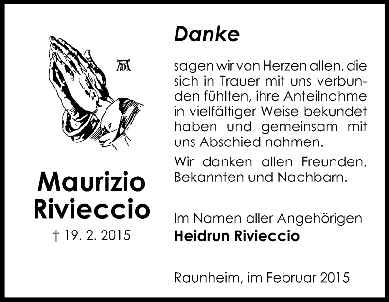 Hier finden Sie alle Traueranzeigen aus der Zeitung, die bisher für Maurizio Rivieccio erschienen sind. Weitere Traueranzeigen, die in der Zeitung erscheinen, werden hier ebenfalls aufgelistet