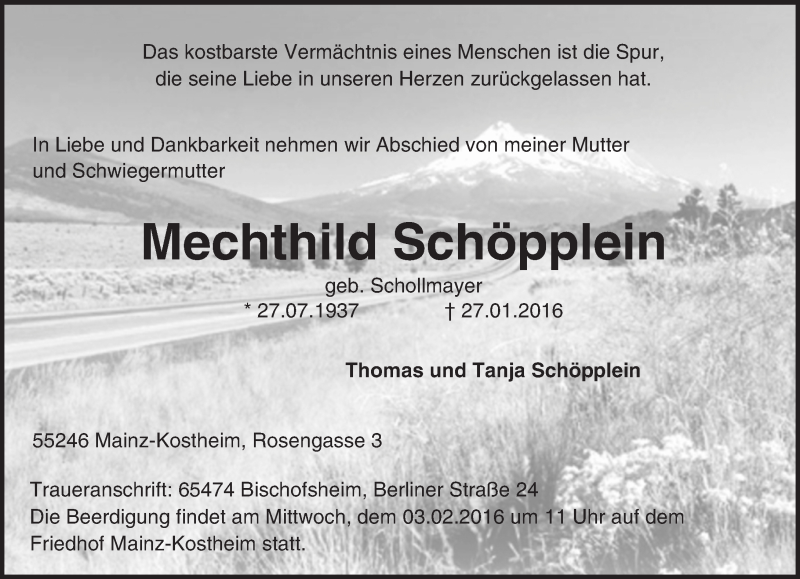 Hier finden Sie alle Traueranzeigen aus der Zeitung, die bisher für Mechthild Schöpplein erschienen sind. Weitere Traueranzeigen, die in der Zeitung erscheinen, werden hier ebenfalls aufgelistet