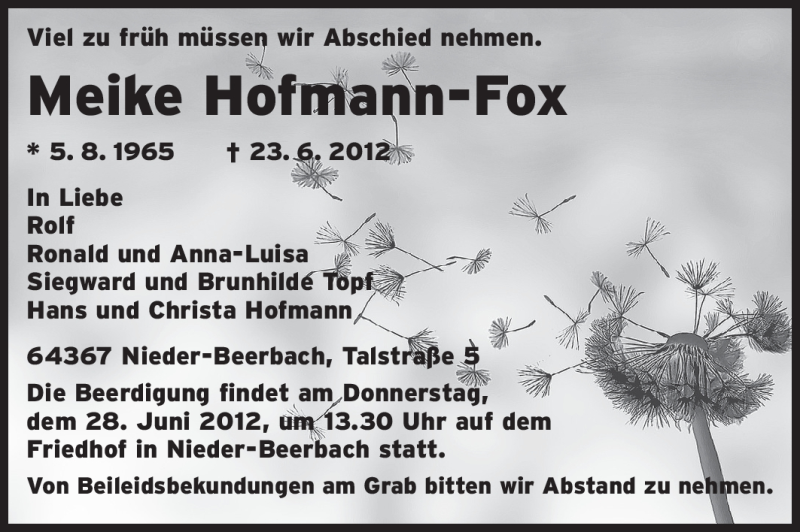 Hier finden Sie alle Traueranzeigen aus der Zeitung, die bisher für Meike Hofmann-Fox erschienen sind. Weitere Traueranzeigen, die in der Zeitung erscheinen, werden hier ebenfalls aufgelistet