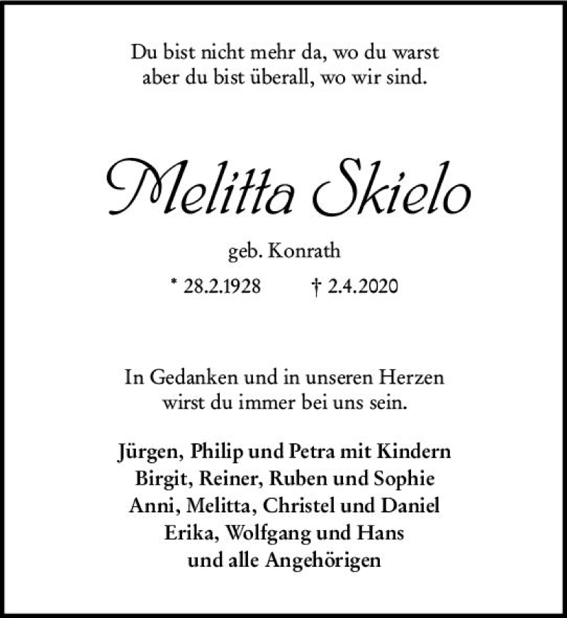 Hier finden Sie alle Traueranzeigen aus der Zeitung, die bisher für Melitta Skielo erschienen sind. Weitere Traueranzeigen, die in der Zeitung erscheinen, werden hier ebenfalls aufgelistet