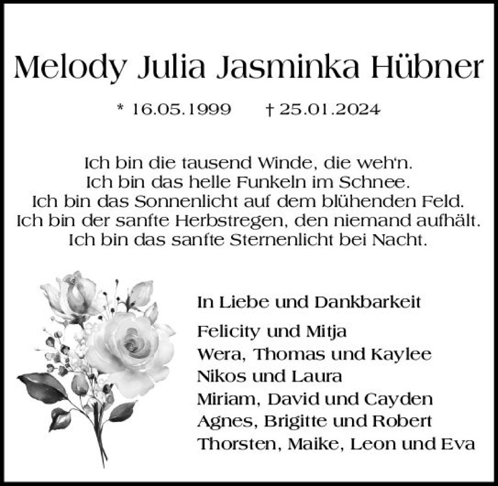 Hier finden Sie alle Traueranzeigen aus der Zeitung, die bisher für Melody Julia Jasminka Hübner erschienen sind. Weitere Traueranzeigen, die in der Zeitung erscheinen, werden hier ebenfalls aufgelistet
