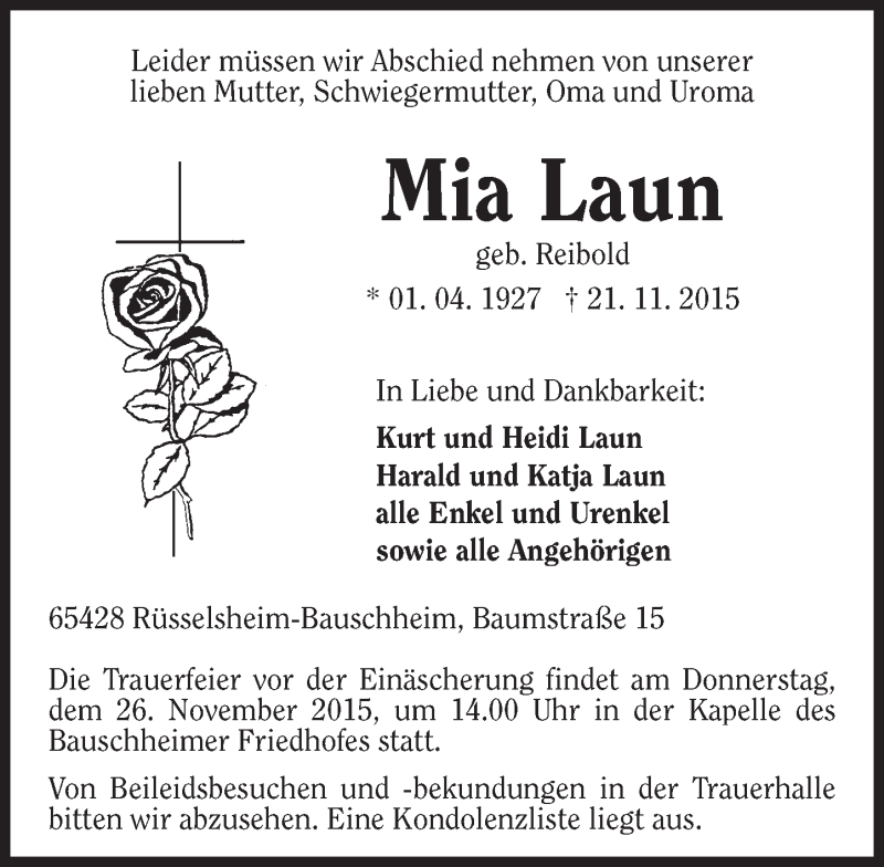 Hier finden Sie alle Traueranzeigen aus der Zeitung, die bisher für Mia Laun erschienen sind. Weitere Traueranzeigen, die in der Zeitung erscheinen, werden hier ebenfalls aufgelistet
