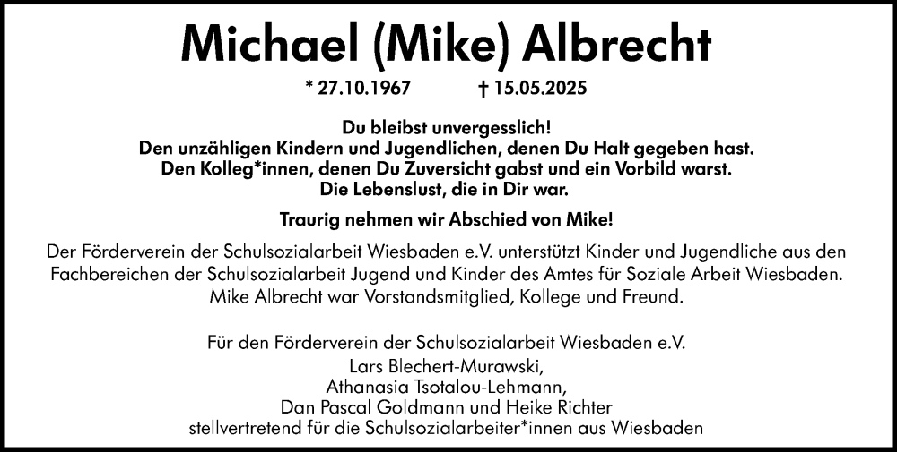 Hier finden Sie alle Traueranzeigen aus der Zeitung, die bisher für Michael Albrecht erschienen sind. Weitere Traueranzeigen, die in der Zeitung erscheinen, werden hier ebenfalls aufgelistet