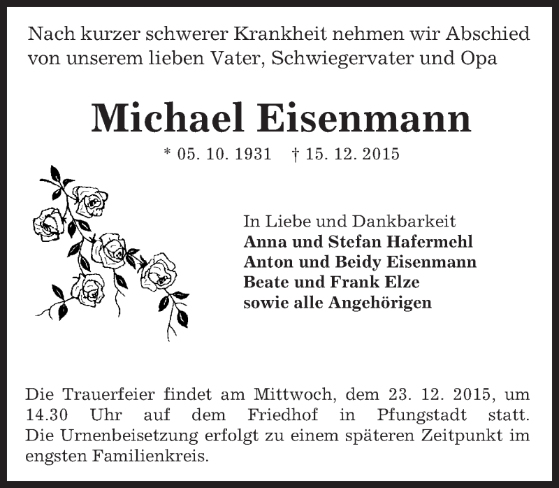 Hier finden Sie alle Traueranzeigen aus der Zeitung, die bisher für Michael Eisenmann erschienen sind. Weitere Traueranzeigen, die in der Zeitung erscheinen, werden hier ebenfalls aufgelistet