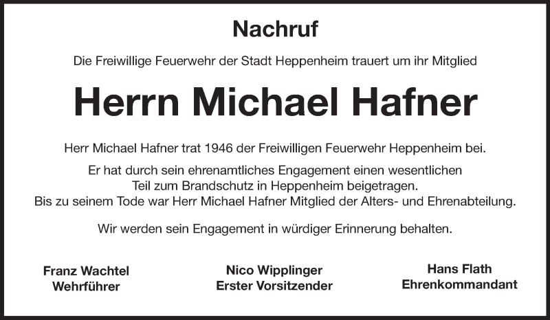 Hier finden Sie alle Traueranzeigen aus der Zeitung, die bisher für Michael Hafner erschienen sind. Weitere Traueranzeigen, die in der Zeitung erscheinen, werden hier ebenfalls aufgelistet