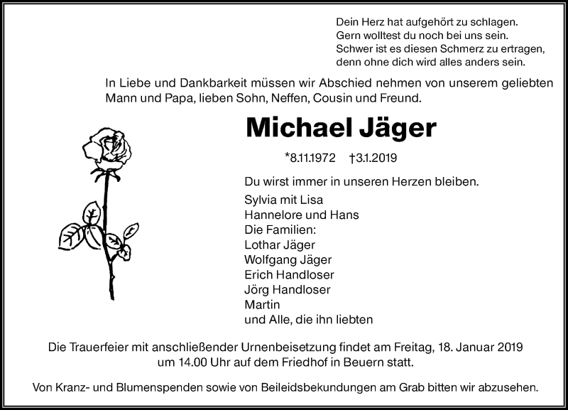 Hier finden Sie alle Traueranzeigen aus der Zeitung, die bisher für Michael Jäger erschienen sind. Weitere Traueranzeigen, die in der Zeitung erscheinen, werden hier ebenfalls aufgelistet
