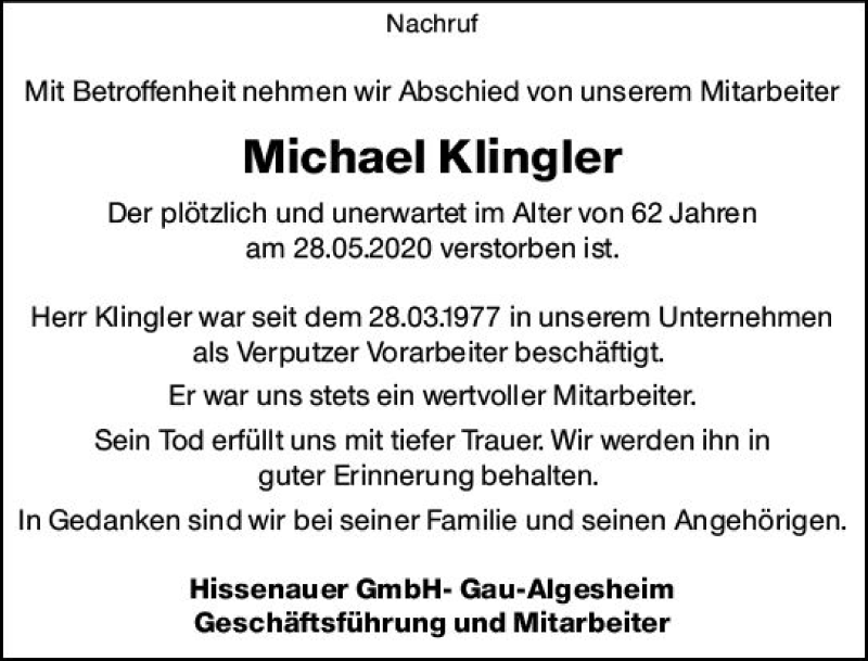 Hier finden Sie alle Traueranzeigen aus der Zeitung, die bisher für Michael Klingler erschienen sind. Weitere Traueranzeigen, die in der Zeitung erscheinen, werden hier ebenfalls aufgelistet
