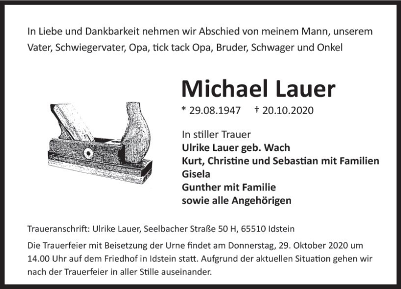 Hier finden Sie alle Traueranzeigen aus der Zeitung, die bisher für Michael Lauer erschienen sind. Weitere Traueranzeigen, die in der Zeitung erscheinen, werden hier ebenfalls aufgelistet