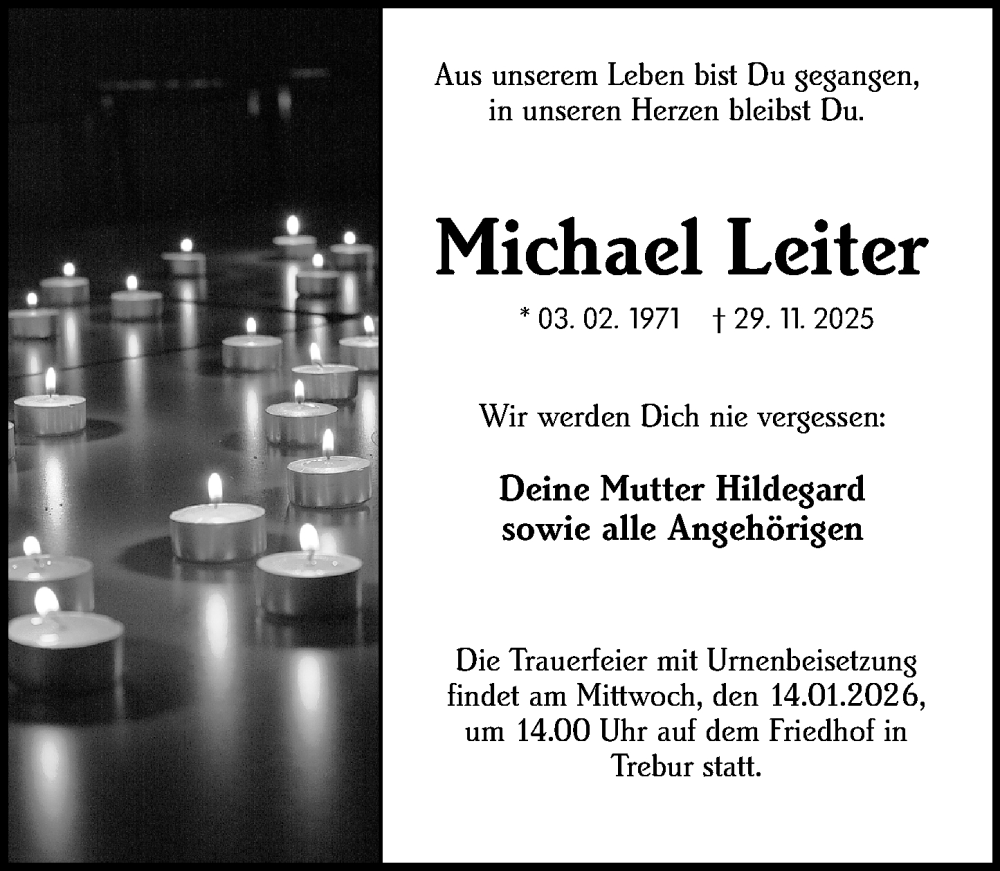 Hier finden Sie alle Traueranzeigen aus der Zeitung, die bisher für Michael Leiter erschienen sind. Weitere Traueranzeigen, die in der Zeitung erscheinen, werden hier ebenfalls aufgelistet