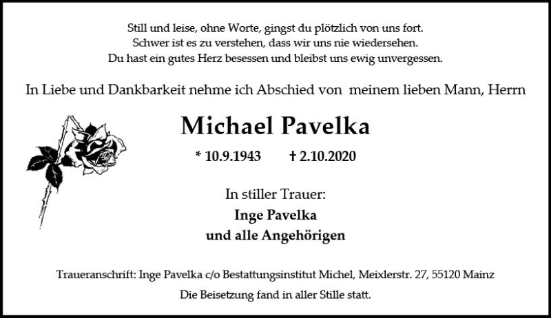 Hier finden Sie alle Traueranzeigen aus der Zeitung, die bisher für Michael Pavelka erschienen sind. Weitere Traueranzeigen, die in der Zeitung erscheinen, werden hier ebenfalls aufgelistet