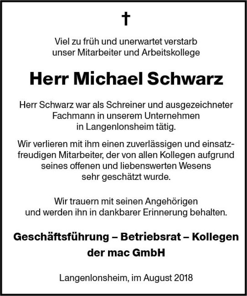 Hier finden Sie alle Traueranzeigen aus der Zeitung, die bisher für Michael Schwarz erschienen sind. Weitere Traueranzeigen, die in der Zeitung erscheinen, werden hier ebenfalls aufgelistet