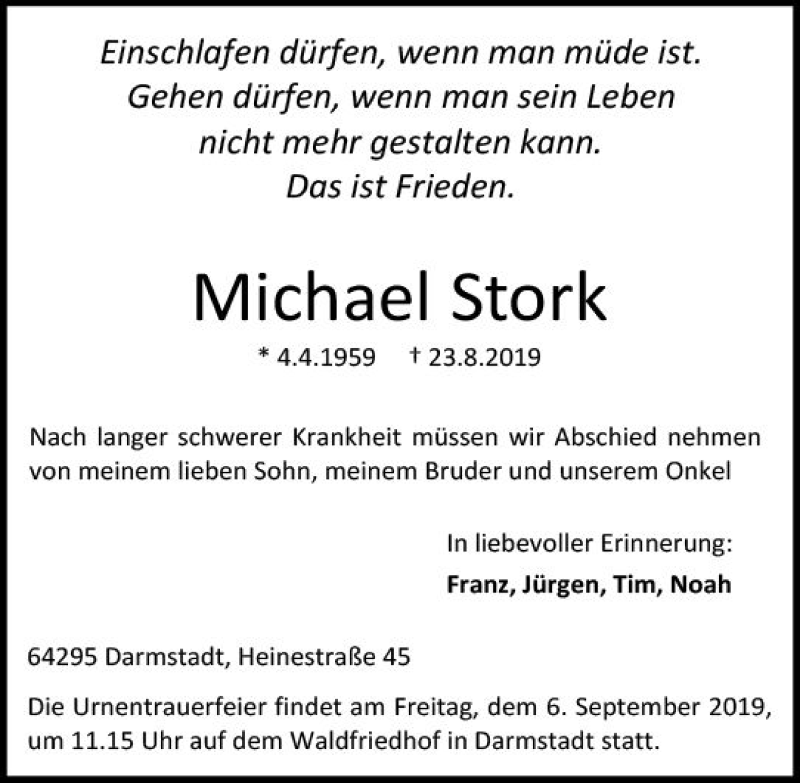 Hier finden Sie alle Traueranzeigen aus der Zeitung, die bisher für Michael Stork erschienen sind. Weitere Traueranzeigen, die in der Zeitung erscheinen, werden hier ebenfalls aufgelistet