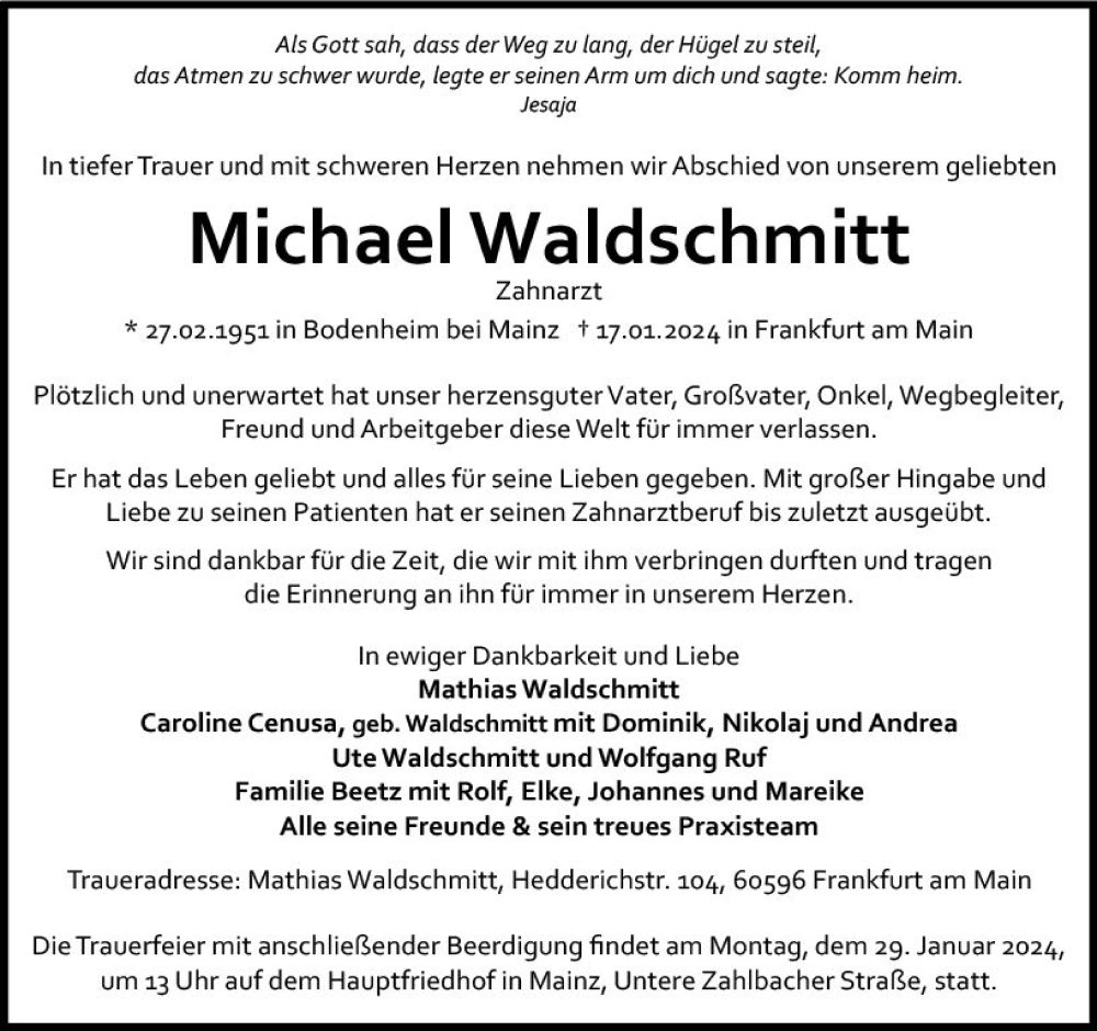 Hier finden Sie alle Traueranzeigen aus der Zeitung, die bisher für Michael Waldschmitt erschienen sind. Weitere Traueranzeigen, die in der Zeitung erscheinen, werden hier ebenfalls aufgelistet