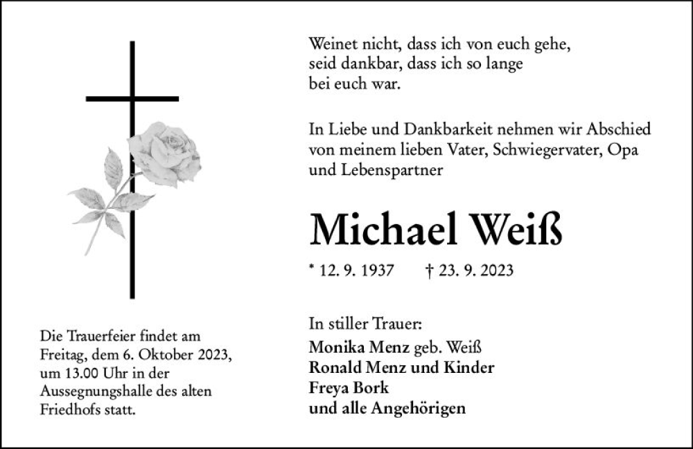 Hier finden Sie alle Traueranzeigen aus der Zeitung, die bisher für Michael Weiß erschienen sind. Weitere Traueranzeigen, die in der Zeitung erscheinen, werden hier ebenfalls aufgelistet