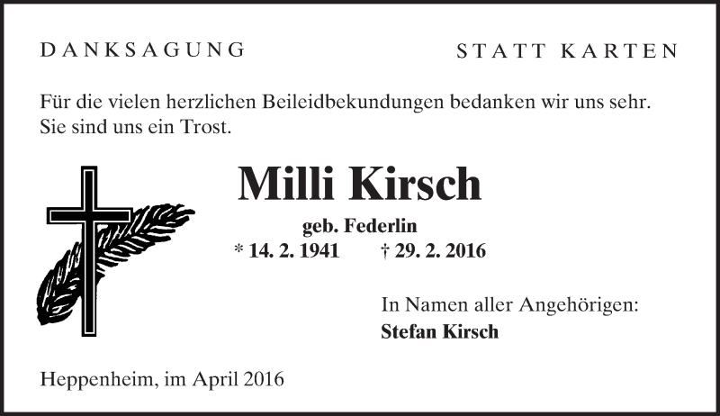 Hier finden Sie alle Traueranzeigen aus der Zeitung, die bisher für Milli Kirsch erschienen sind. Weitere Traueranzeigen, die in der Zeitung erscheinen, werden hier ebenfalls aufgelistet