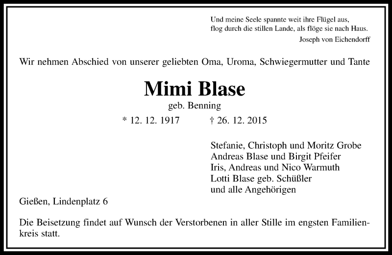Hier finden Sie alle Traueranzeigen aus der Zeitung, die bisher für Mimi Blase erschienen sind. Weitere Traueranzeigen, die in der Zeitung erscheinen, werden hier ebenfalls aufgelistet