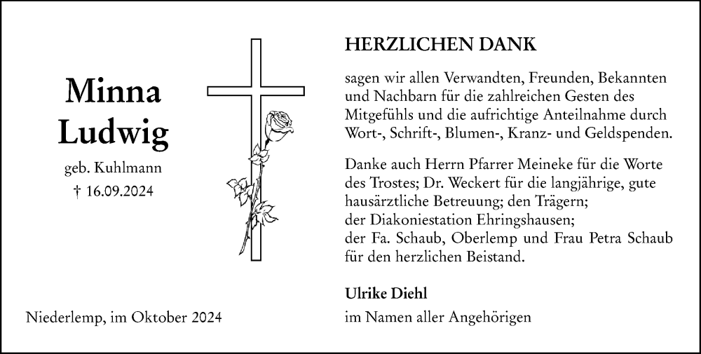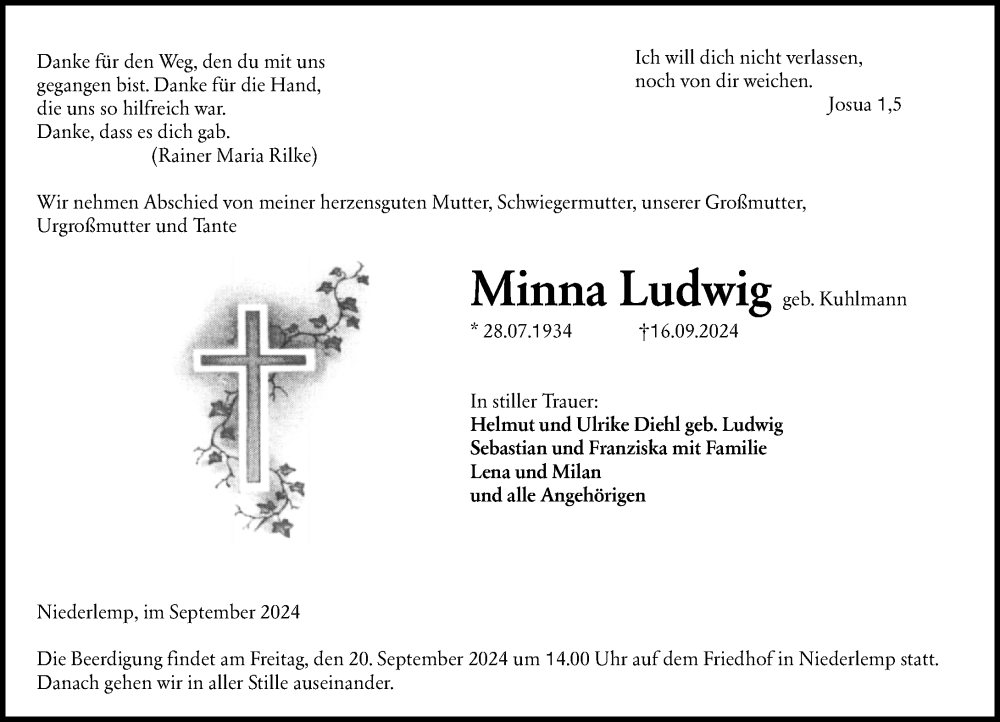 Hier finden Sie alle Traueranzeigen aus der Zeitung, die bisher für Minna Ludwig erschienen sind. Weitere Traueranzeigen, die in der Zeitung erscheinen, werden hier ebenfalls aufgelistet