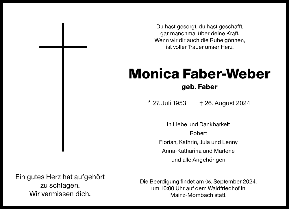 Hier finden Sie alle Traueranzeigen aus der Zeitung, die bisher für Monica Faber-Weber erschienen sind. Weitere Traueranzeigen, die in der Zeitung erscheinen, werden hier ebenfalls aufgelistet