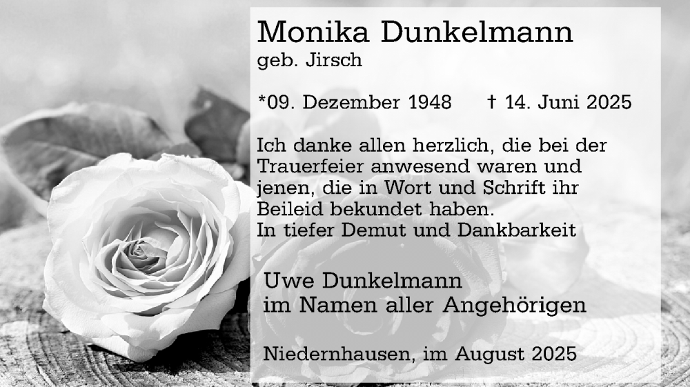 Hier finden Sie alle Traueranzeigen aus der Zeitung, die bisher für Monika Dunkelmann erschienen sind. Weitere Traueranzeigen, die in der Zeitung erscheinen, werden hier ebenfalls aufgelistet