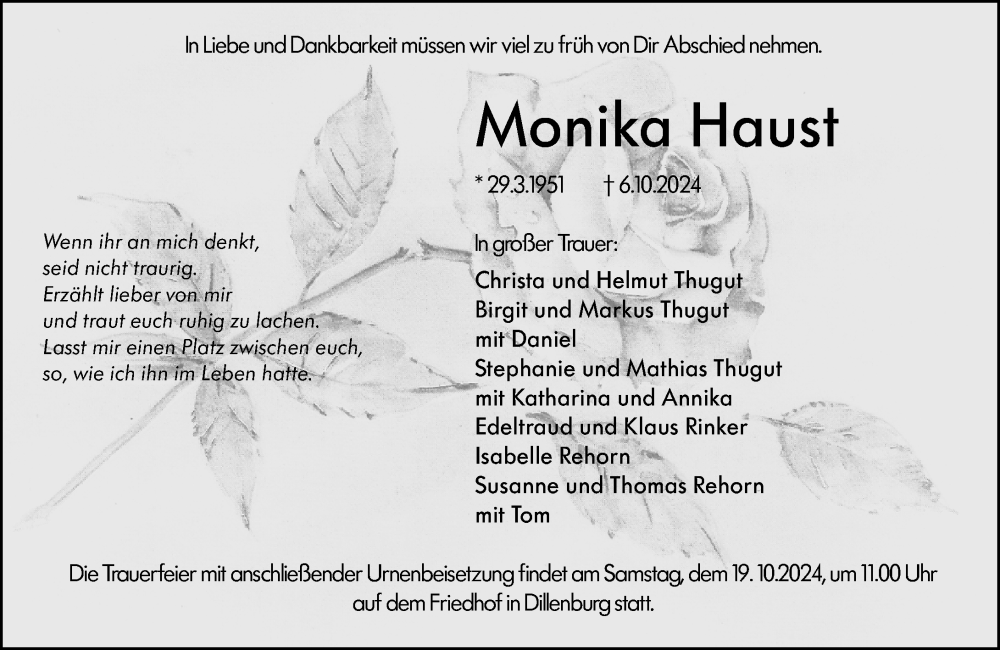 Hier finden Sie alle Traueranzeigen aus der Zeitung, die bisher für Monika Haust erschienen sind. Weitere Traueranzeigen, die in der Zeitung erscheinen, werden hier ebenfalls aufgelistet
