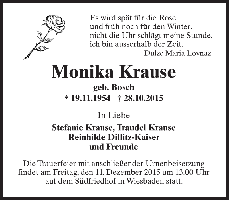 Hier finden Sie alle Traueranzeigen aus der Zeitung, die bisher für Monika Krause erschienen sind. Weitere Traueranzeigen, die in der Zeitung erscheinen, werden hier ebenfalls aufgelistet