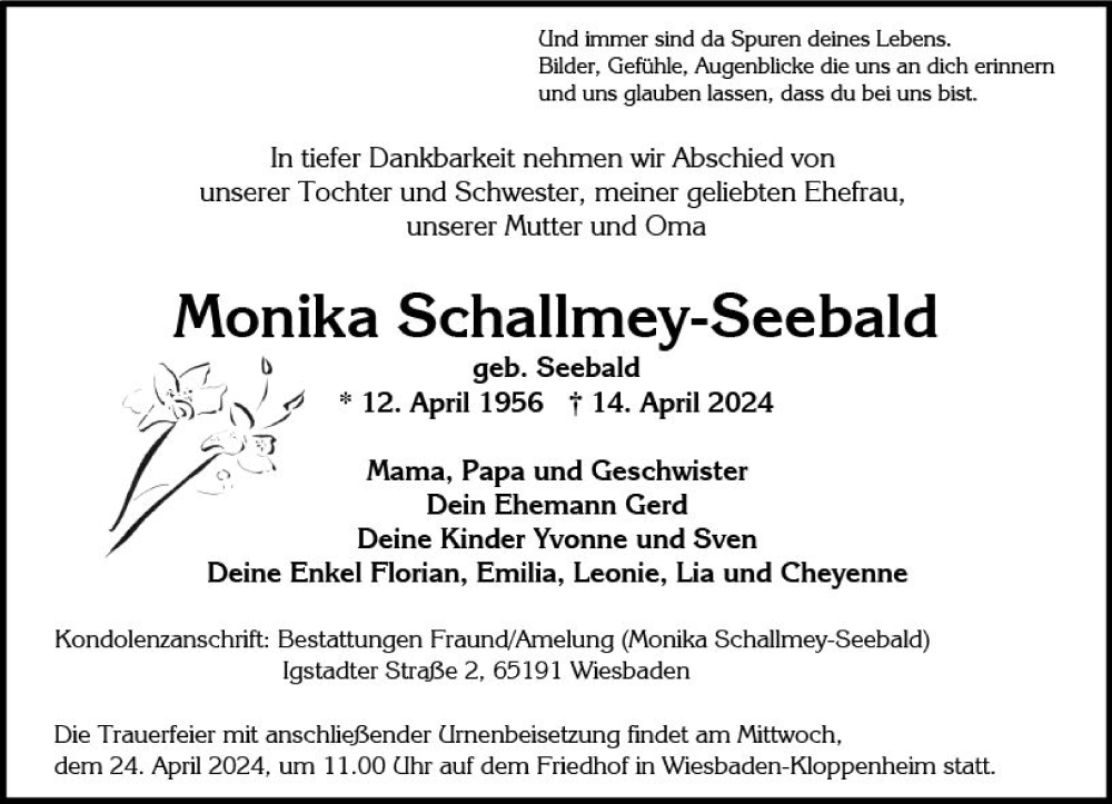 Hier finden Sie alle Traueranzeigen aus der Zeitung, die bisher für Monika Schallmey-Seebald erschienen sind. Weitere Traueranzeigen, die in der Zeitung erscheinen, werden hier ebenfalls aufgelistet