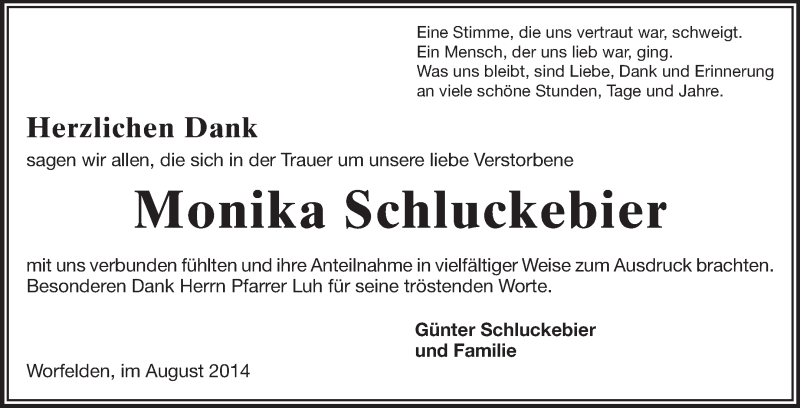 Hier finden Sie alle Traueranzeigen aus der Zeitung, die bisher für Monika Schluckebier erschienen sind. Weitere Traueranzeigen, die in der Zeitung erscheinen, werden hier ebenfalls aufgelistet