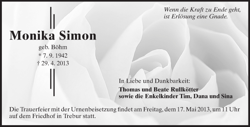Hier finden Sie alle Traueranzeigen aus der Zeitung, die bisher für Monika Simon erschienen sind. Weitere Traueranzeigen, die in der Zeitung erscheinen, werden hier ebenfalls aufgelistet