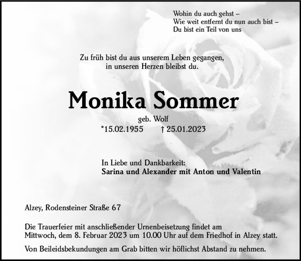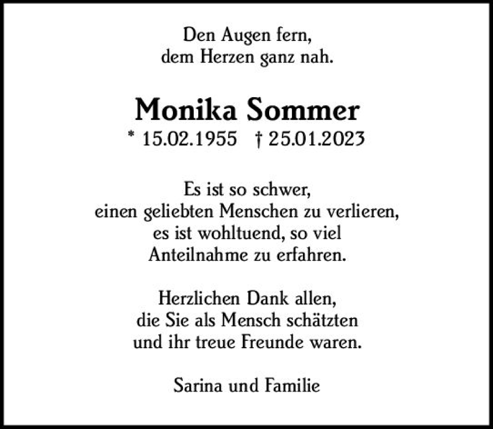 Hier finden Sie alle Traueranzeigen aus der Zeitung, die bisher für Monika Sommer erschienen sind. Weitere Traueranzeigen, die in der Zeitung erscheinen, werden hier ebenfalls aufgelistet