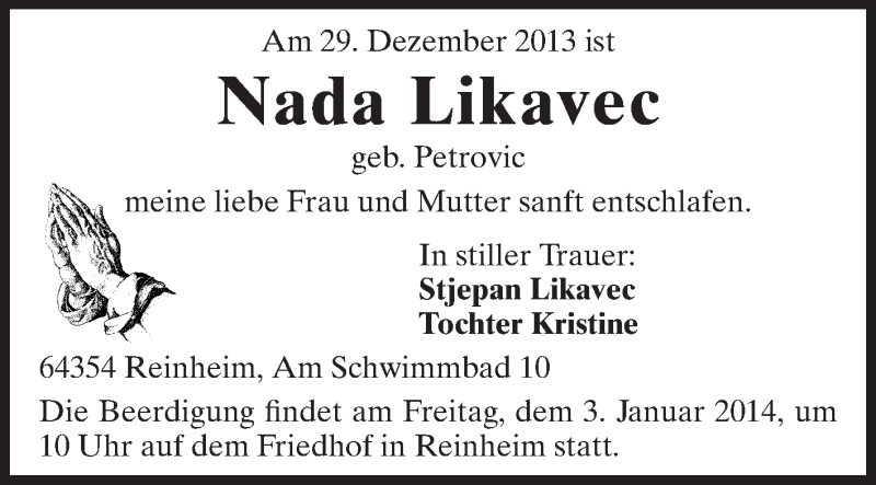 Hier finden Sie alle Traueranzeigen aus der Zeitung, die bisher für Nada Likavec erschienen sind. Weitere Traueranzeigen, die in der Zeitung erscheinen, werden hier ebenfalls aufgelistet