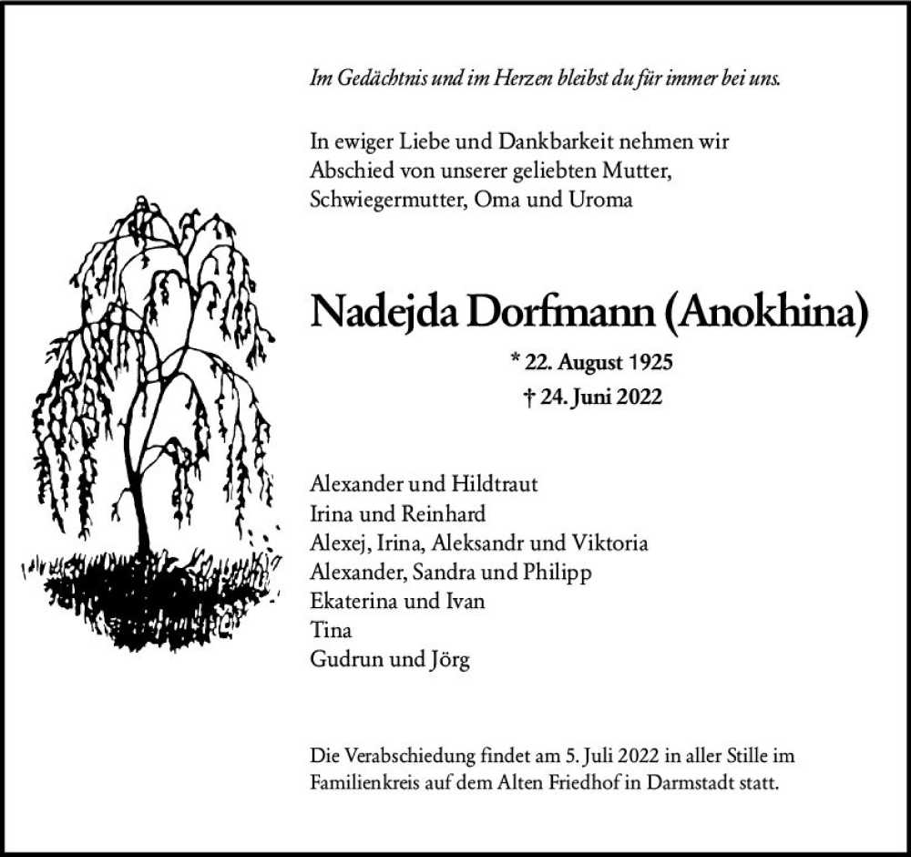 Hier finden Sie alle Traueranzeigen aus der Zeitung, die bisher für Nadejda Dorfmann erschienen sind. Weitere Traueranzeigen, die in der Zeitung erscheinen, werden hier ebenfalls aufgelistet