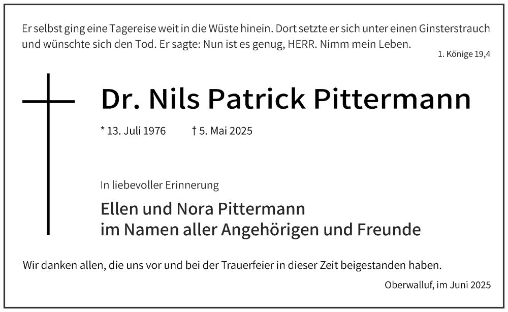 Hier finden Sie alle Traueranzeigen aus der Zeitung, die bisher für Nils Patrick Pittermann erschienen sind. Weitere Traueranzeigen, die in der Zeitung erscheinen, werden hier ebenfalls aufgelistet