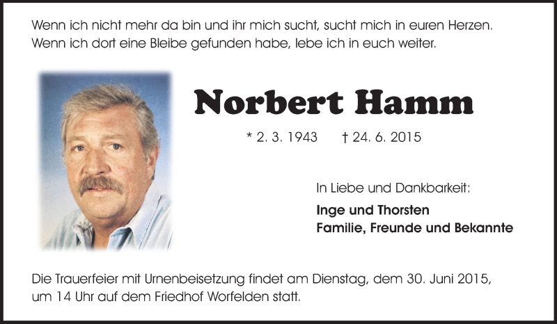 Hier finden Sie alle Traueranzeigen aus der Zeitung, die bisher für Norbert Hamm erschienen sind. Weitere Traueranzeigen, die in der Zeitung erscheinen, werden hier ebenfalls aufgelistet