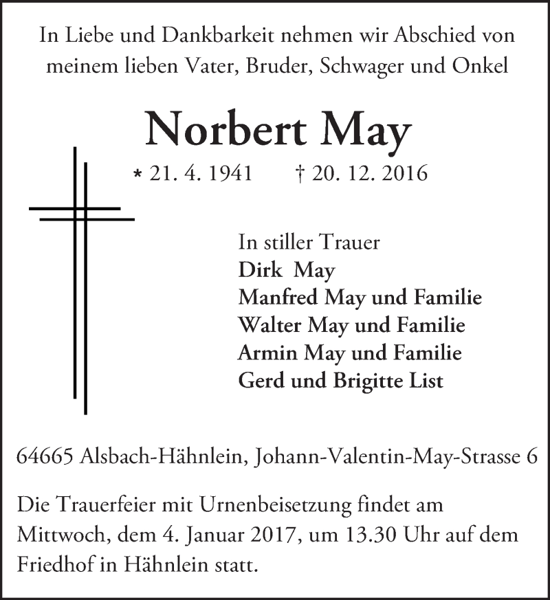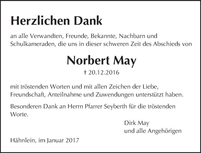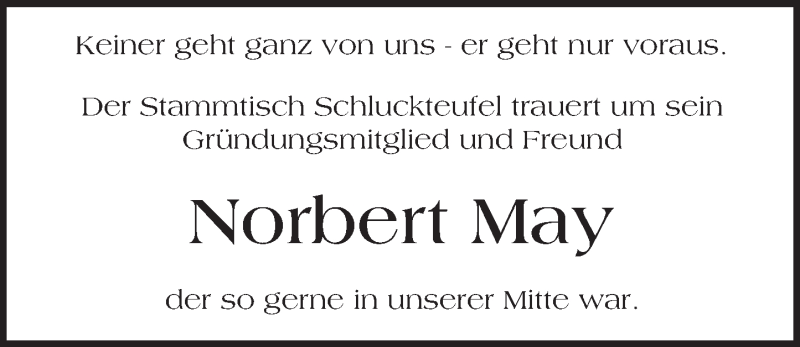 Hier finden Sie alle Traueranzeigen aus der Zeitung, die bisher für Norbert May erschienen sind. Weitere Traueranzeigen, die in der Zeitung erscheinen, werden hier ebenfalls aufgelistet