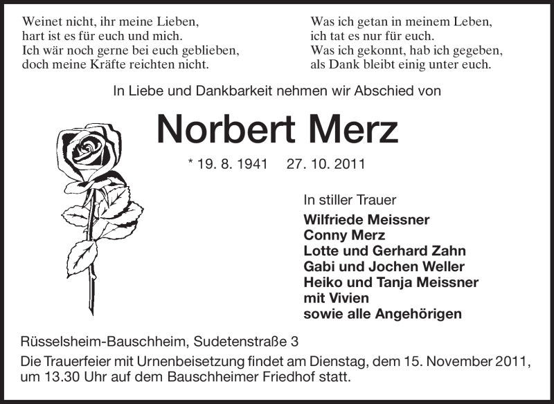 Hier finden Sie alle Traueranzeigen aus der Zeitung, die bisher für Norbert Merz erschienen sind. Weitere Traueranzeigen, die in der Zeitung erscheinen, werden hier ebenfalls aufgelistet