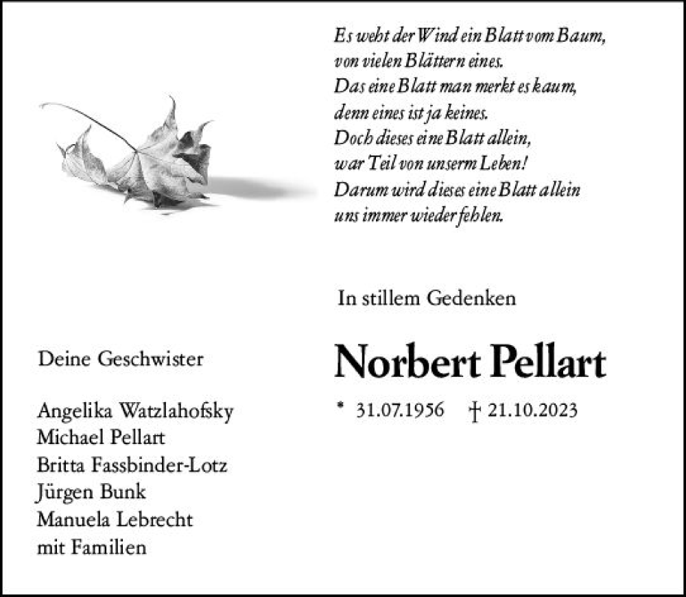 Hier finden Sie alle Traueranzeigen aus der Zeitung, die bisher für Norbert Pellart erschienen sind. Weitere Traueranzeigen, die in der Zeitung erscheinen, werden hier ebenfalls aufgelistet