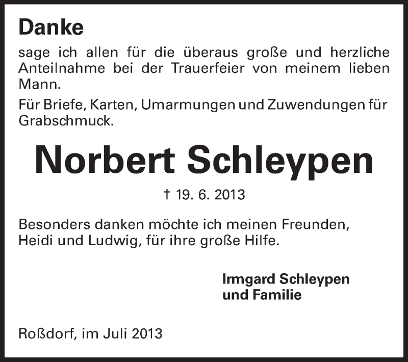 Hier finden Sie alle Traueranzeigen aus der Zeitung, die bisher für Norbert Schleypen erschienen sind. Weitere Traueranzeigen, die in der Zeitung erscheinen, werden hier ebenfalls aufgelistet