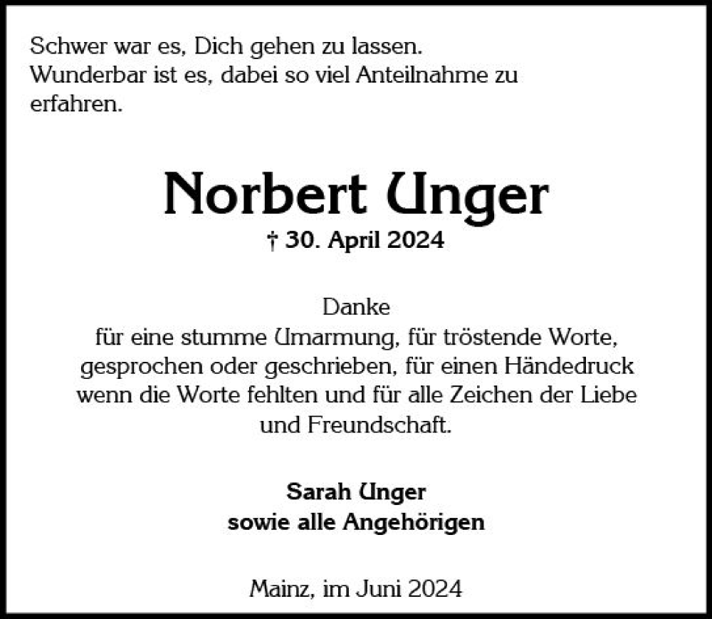 Hier finden Sie alle Traueranzeigen aus der Zeitung, die bisher für Norbert Unger erschienen sind. Weitere Traueranzeigen, die in der Zeitung erscheinen, werden hier ebenfalls aufgelistet