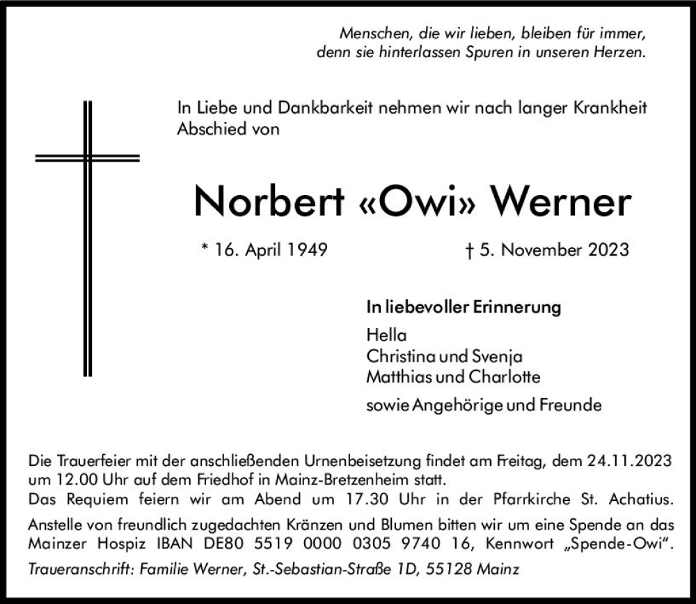 Hier finden Sie alle Traueranzeigen aus der Zeitung, die bisher für Norbert Werner erschienen sind. Weitere Traueranzeigen, die in der Zeitung erscheinen, werden hier ebenfalls aufgelistet