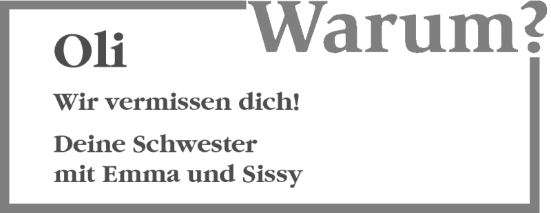 Hier finden Sie alle Traueranzeigen aus der Zeitung, die bisher für Oliver Frey erschienen sind. Weitere Traueranzeigen, die in der Zeitung erscheinen, werden hier ebenfalls aufgelistet