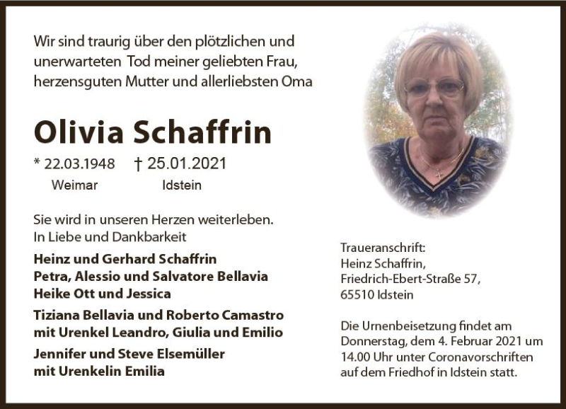 Hier finden Sie alle Traueranzeigen aus der Zeitung, die bisher für Olivia Schaffrin erschienen sind. Weitere Traueranzeigen, die in der Zeitung erscheinen, werden hier ebenfalls aufgelistet