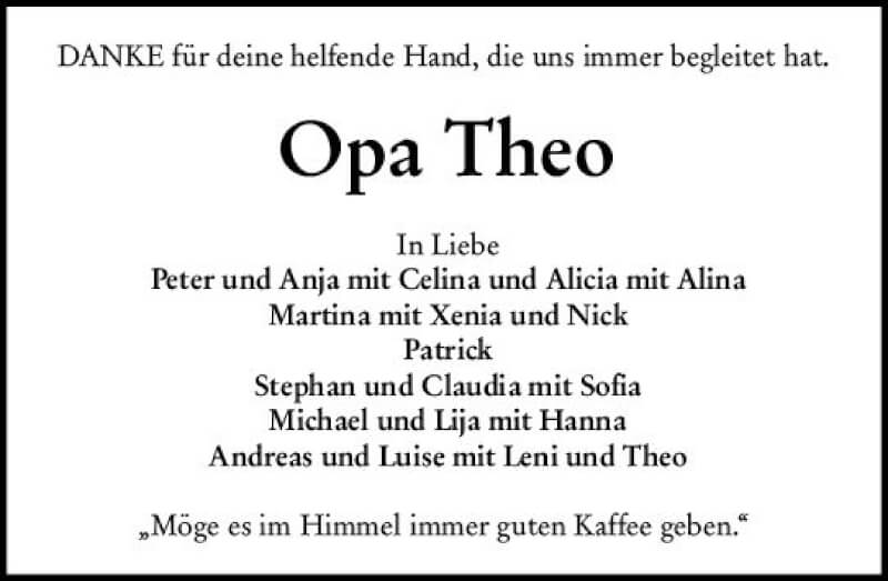 Hier finden Sie alle Traueranzeigen aus der Zeitung, die bisher für Opa Theo erschienen sind. Weitere Traueranzeigen, die in der Zeitung erscheinen, werden hier ebenfalls aufgelistet