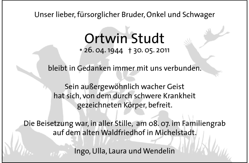 Hier finden Sie alle Traueranzeigen aus der Zeitung, die bisher für Ortwin Studt erschienen sind. Weitere Traueranzeigen, die in der Zeitung erscheinen, werden hier ebenfalls aufgelistet