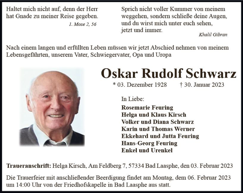 Hier finden Sie alle Traueranzeigen aus der Zeitung, die bisher für Oskar Rudolf Schwarz erschienen sind. Weitere Traueranzeigen, die in der Zeitung erscheinen, werden hier ebenfalls aufgelistet