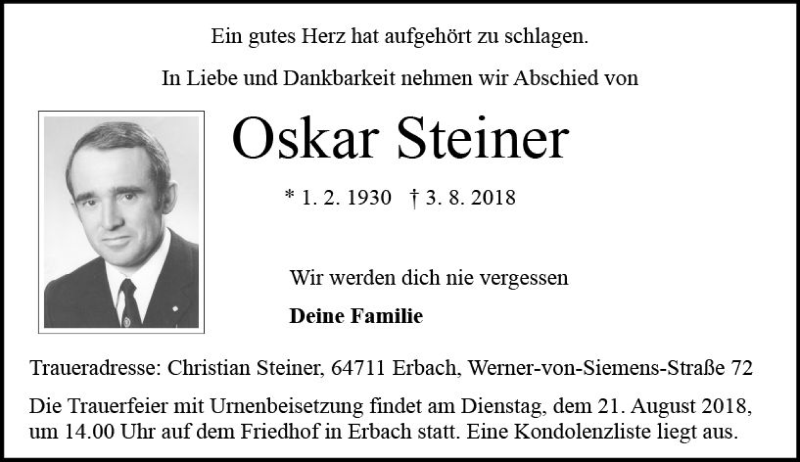 Hier finden Sie alle Traueranzeigen aus der Zeitung, die bisher für Oskar Steiner erschienen sind. Weitere Traueranzeigen, die in der Zeitung erscheinen, werden hier ebenfalls aufgelistet