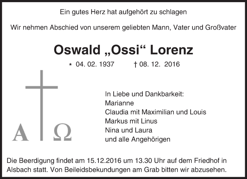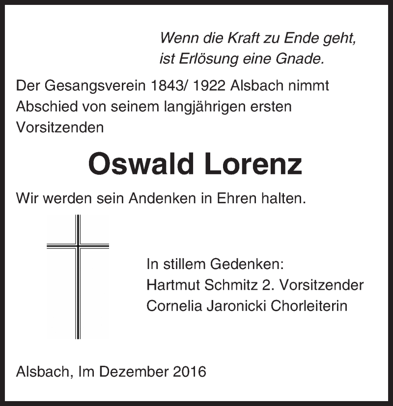 Hier finden Sie alle Traueranzeigen aus der Zeitung, die bisher für Oswald Lorenz erschienen sind. Weitere Traueranzeigen, die in der Zeitung erscheinen, werden hier ebenfalls aufgelistet