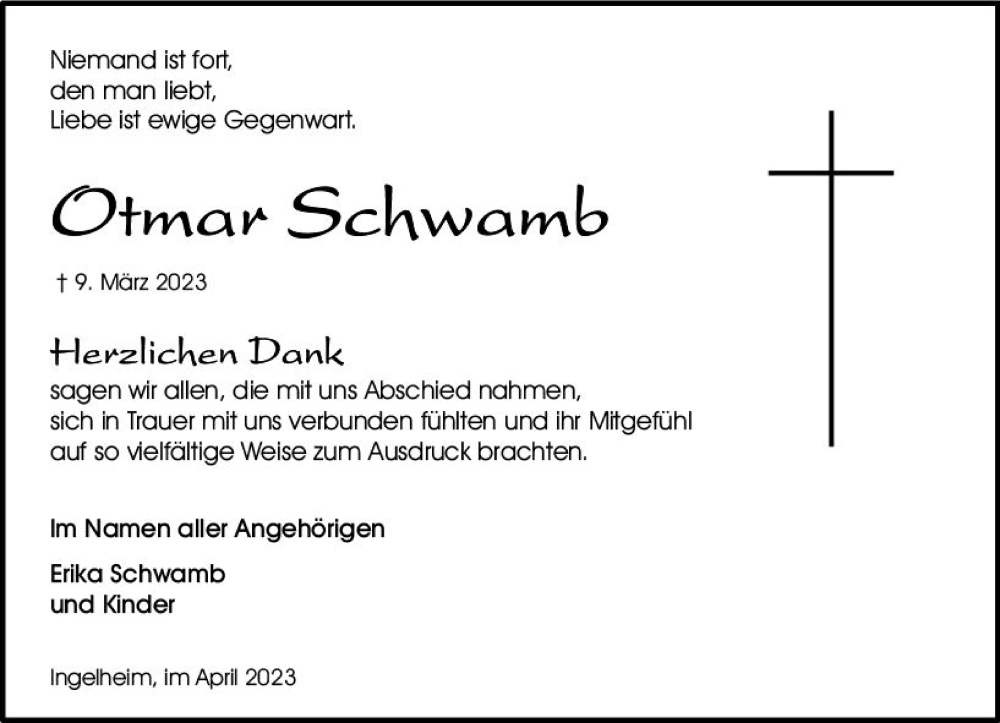Hier finden Sie alle Traueranzeigen aus der Zeitung, die bisher für Otmar Schwamb erschienen sind. Weitere Traueranzeigen, die in der Zeitung erscheinen, werden hier ebenfalls aufgelistet