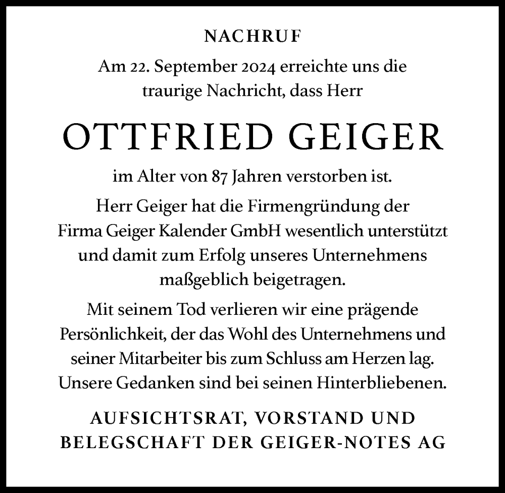 Hier finden Sie alle Traueranzeigen aus der Zeitung, die bisher für Ottfried Geiger erschienen sind. Weitere Traueranzeigen, die in der Zeitung erscheinen, werden hier ebenfalls aufgelistet