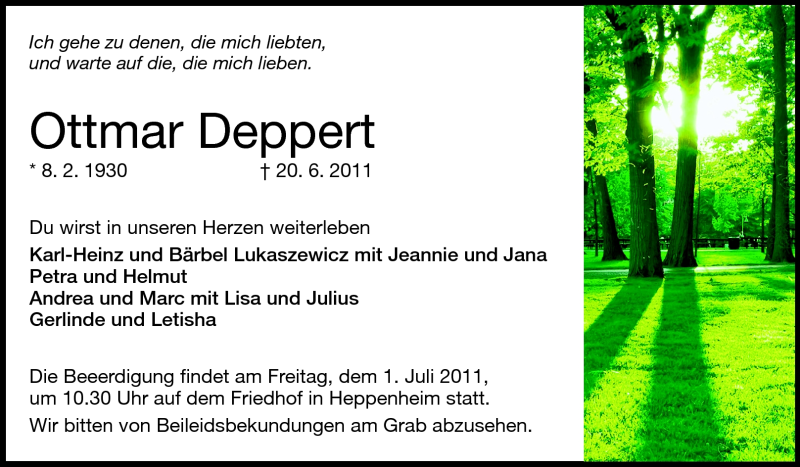 Hier finden Sie alle Traueranzeigen aus der Zeitung, die bisher für Ottmar Deppert erschienen sind. Weitere Traueranzeigen, die in der Zeitung erscheinen, werden hier ebenfalls aufgelistet