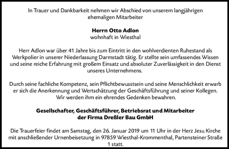 Hier finden Sie alle Traueranzeigen aus der Zeitung, die bisher für Otto Adlon erschienen sind. Weitere Traueranzeigen, die in der Zeitung erscheinen, werden hier ebenfalls aufgelistet